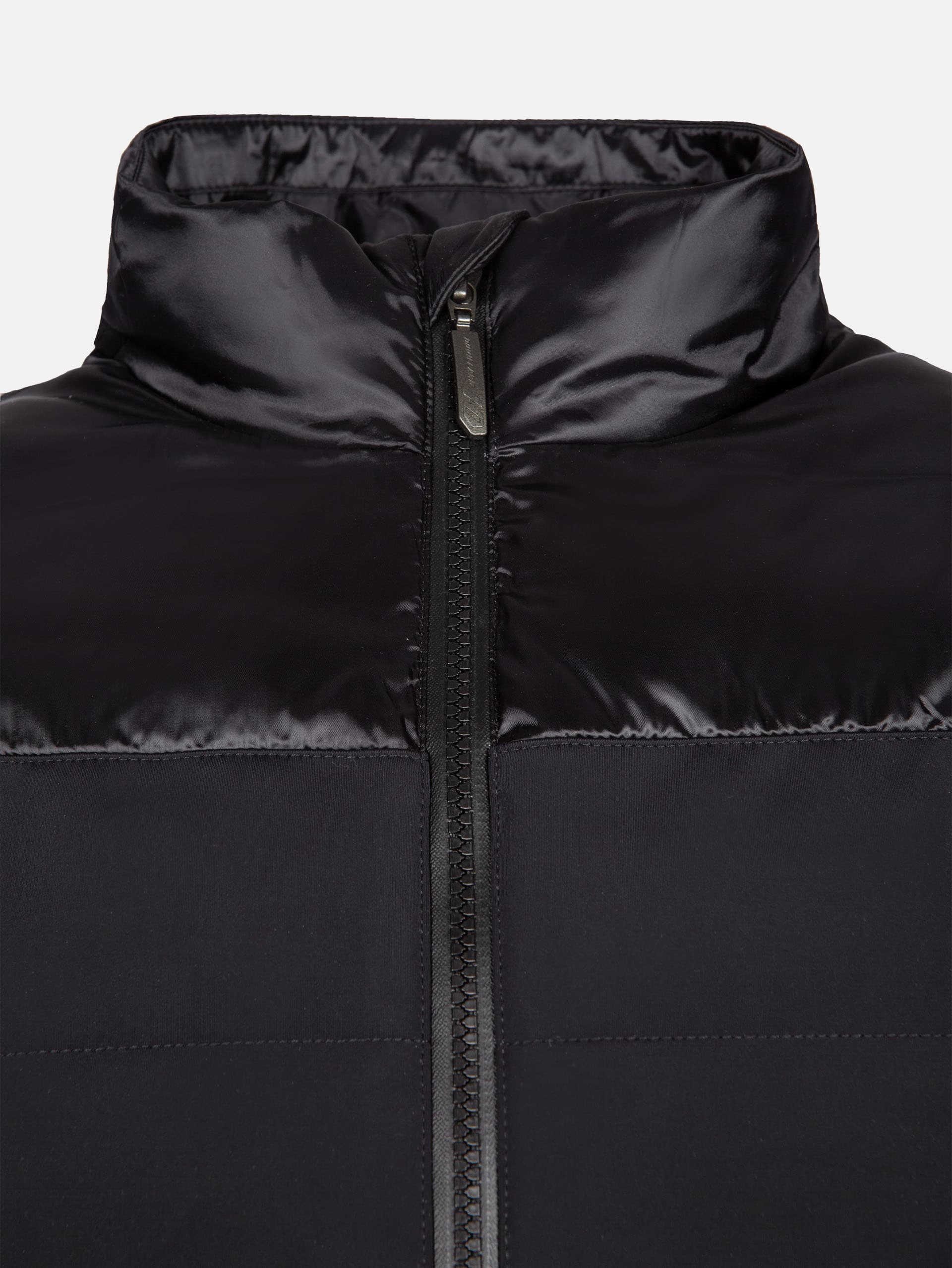 Ce vêtement sans manches et au col montant incarne le chic contemporain, combinée à des détails pratiques tels que les deux poches zippées sur les côtés et la poche intérieure zippée. Le matelassage bi-matière en nylon et la doublure imprimée offrent un confort optimal, créant une pièce qui allie style et utilité.